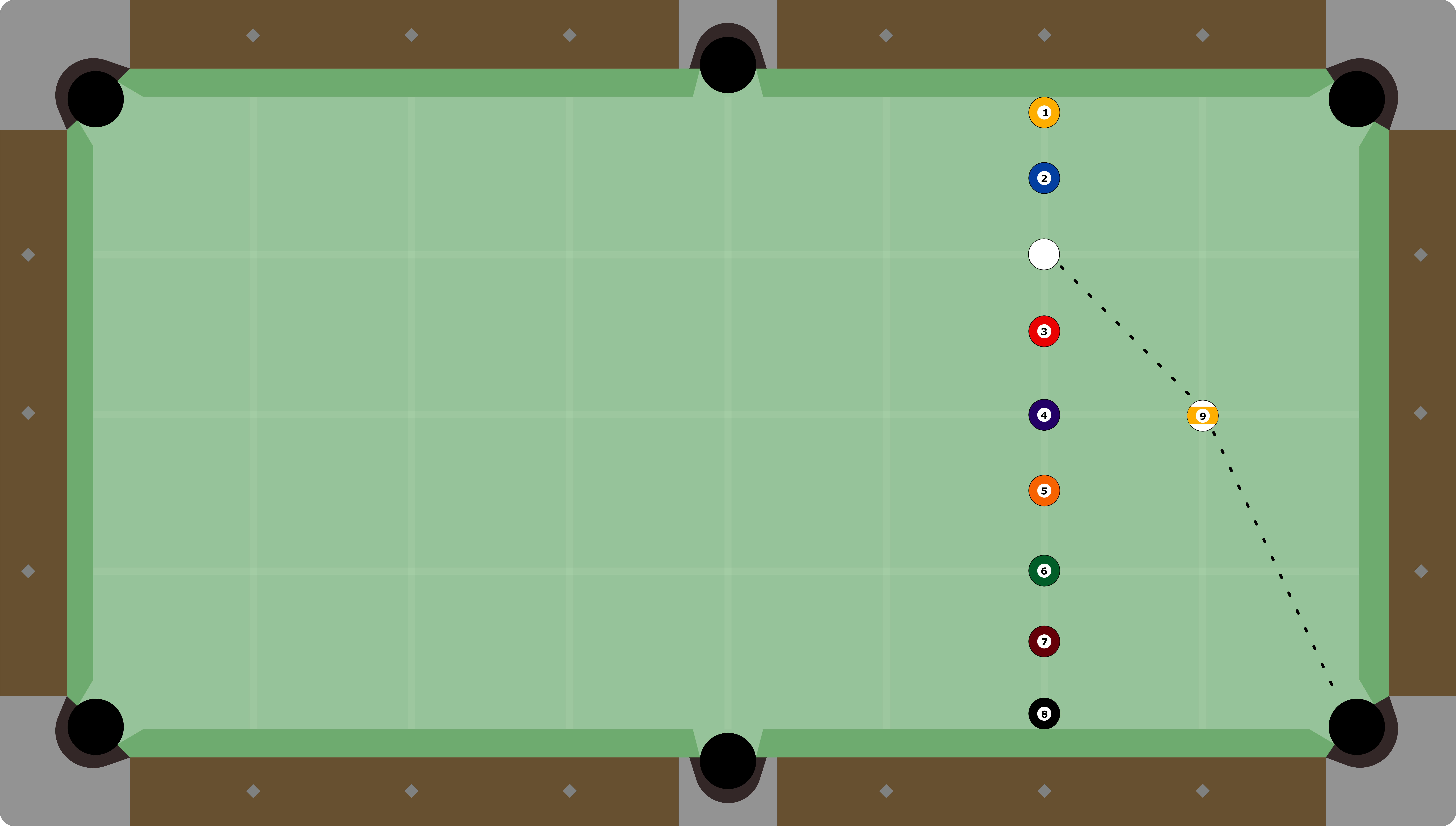 Set one object ball one diamond away from the side pocket. Place target balls on the rail at each diamond and in front of both corner pockets on one side of the table. Starting with ball in hand on each shot, pocket the object ball, then send the cue-ball to contact a called target ball without contacting any other target balls. The cue-ball may contact the rail immediately before striking the target ball, but it may not use a rail-first kick to reach the target. For example, you may not strike the long rail first to then contact a target ball on the short rail.