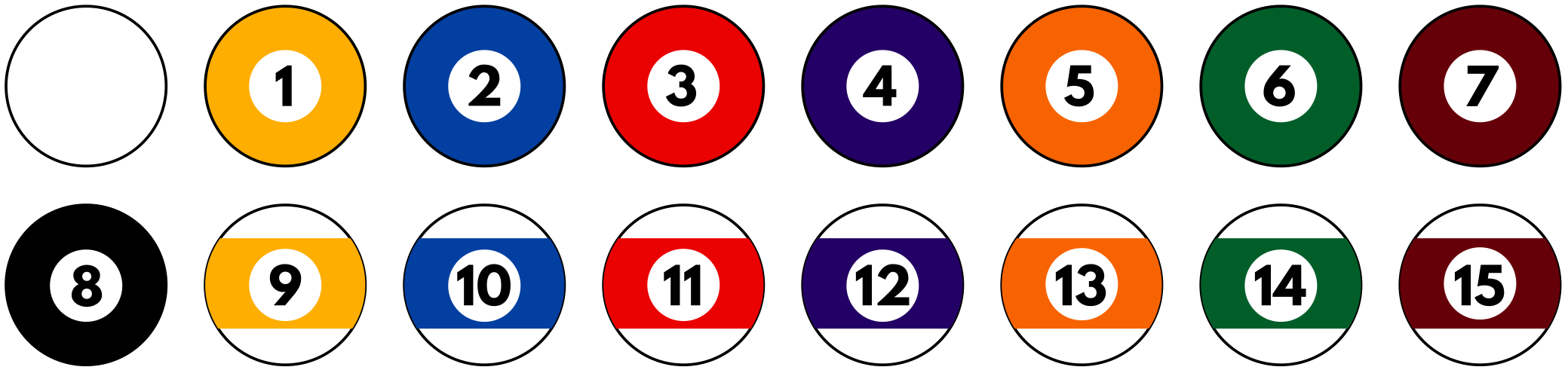 The cue ball and object balls 1 through 15 are used.