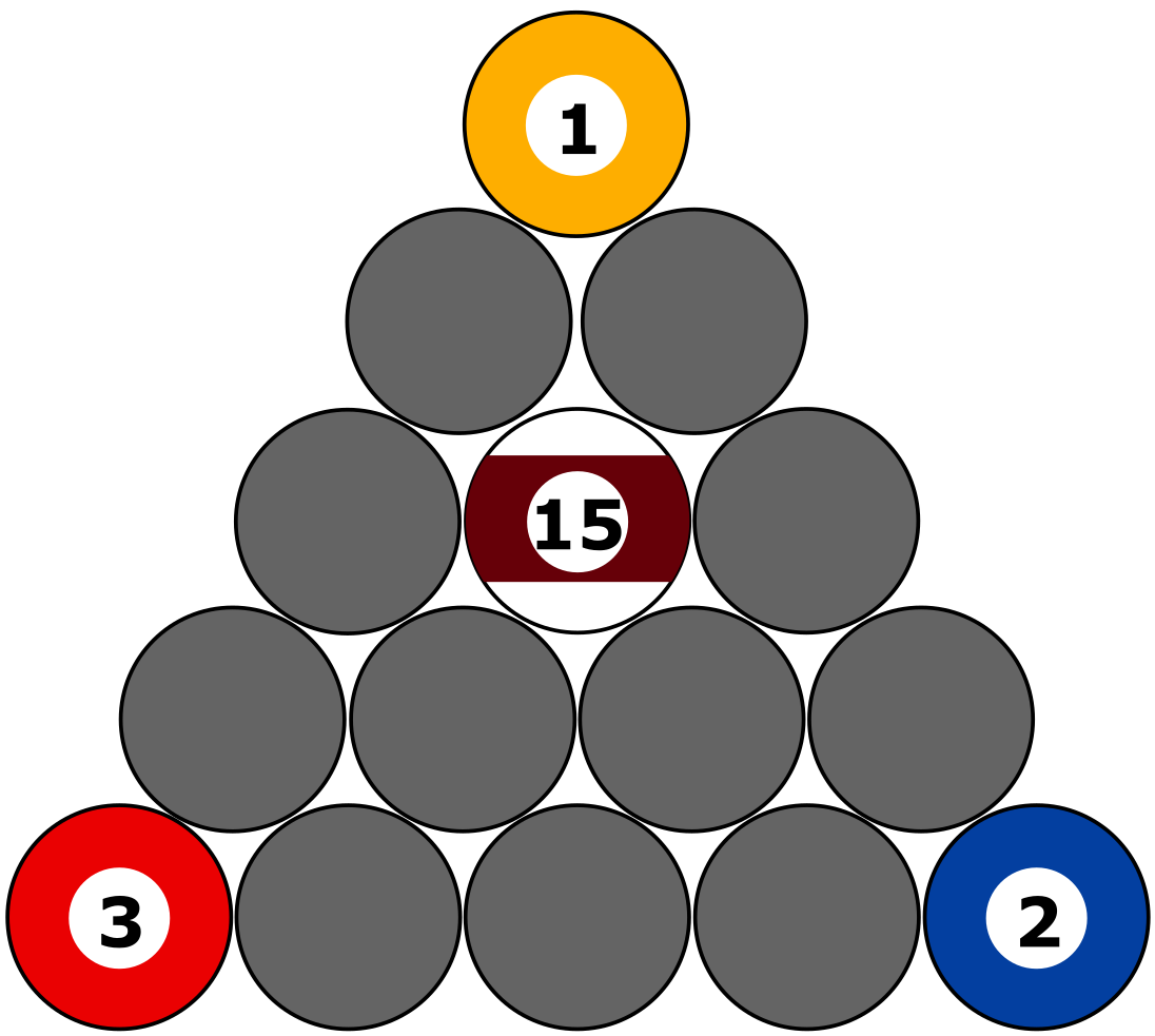 The fifteen object-balls are racked as tightly as possible in a triangle, with the 1-ball at the apex and on the foot spot, 2-ball on the rear right corner, 3-ball on the rear left corner, and 15-ball in the middle as the first ball that is directly below the apex. The other object-balls will be placed in the triangle without purposeful or intentional pattern.